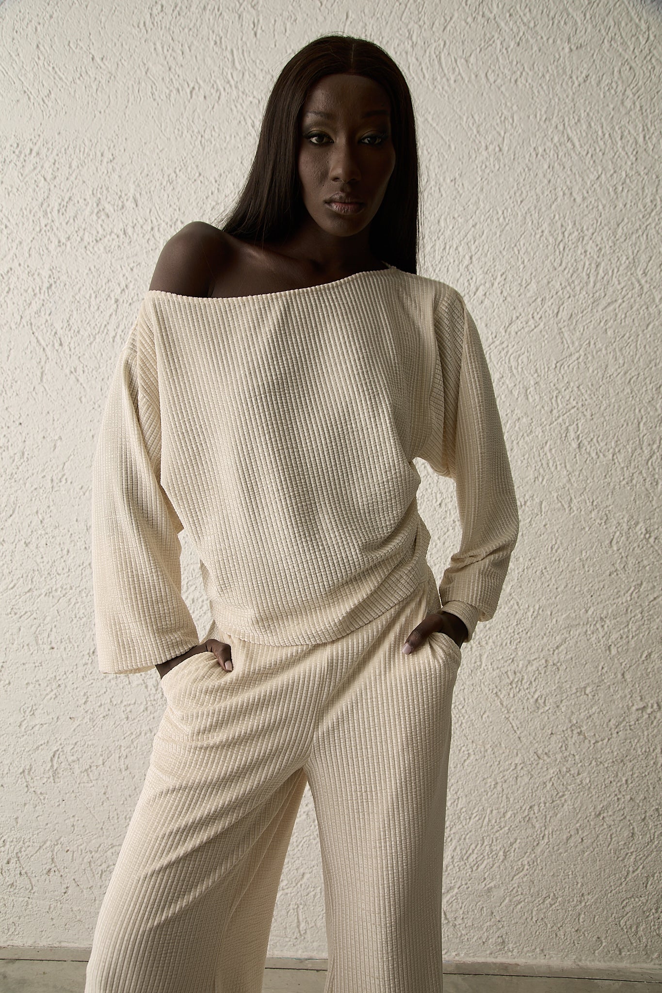 Maglia leggera con lavorazione, dal taglio morbido e versatile. Il modello presenta scollo ampio che può essere portato anche leggermente scivolato su una spalla, per un tocco femminile e rilassato. Le maniche lunghe a volume morbido e la vestibilità comoda la rendono ideale per un look casual-chic quotidiano.