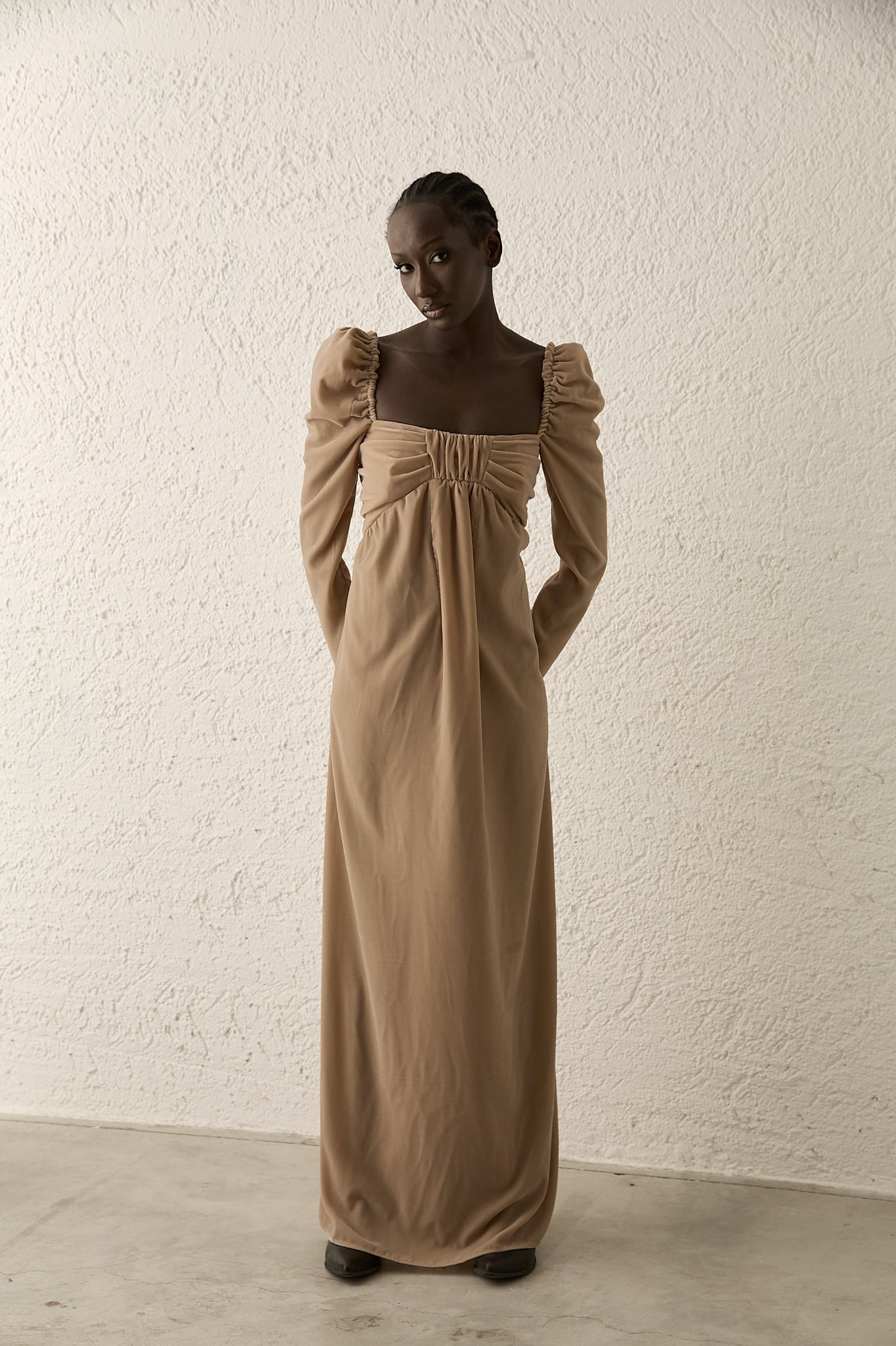 Un capo che celebra la delicatezza delle forme: l’abito lungo Bohemianvì gioca con volumi leggeri sulle maniche arricciate e un elegante scollo dritto che incornicia la figura. La costruzione del corpetto dona armonia e femminilità, mentre la linea morbida accompagna i movimenti con naturalezza. Un pezzo unico, pensato per chi ama la semplicità sofisticata.