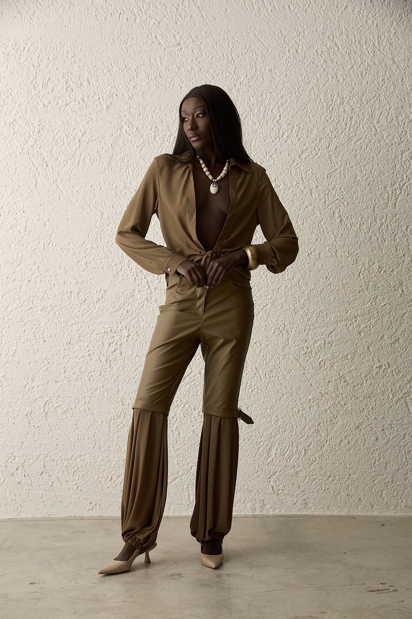 Pantalone a vita alta realizzato in ecopelle morbida con dettagli in chiffon fluido, per un look contemporaneo ed elegante. La linea pulita si arricchisce di un design unico grazie al contrasto dei tessuti: la parte superiore in ecopelle scolpisce la silhouette, mentre gli inserti in chiffon leggero donano movimento e un tocco sofisticato.