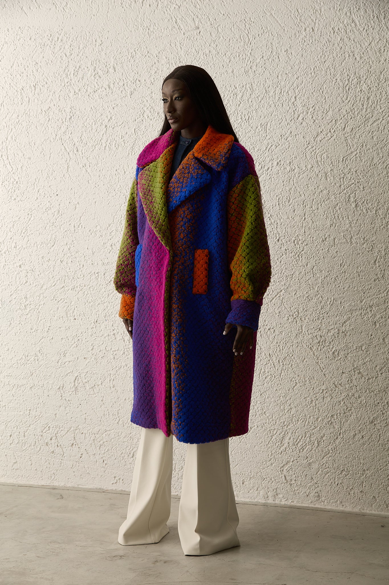 Cappotto dal taglio lungo e avvolgente, realizzato in tessuto jacquard effetto bouclé con motivo multicolor vivace. Caratterizzato da ampi revers, maniche leggermente a volume e tasche frontali applicate, unisce comfort e stile audace. Perfetto per dare carattere ai look invernali con un tocco sofisticato e contemporaneo.