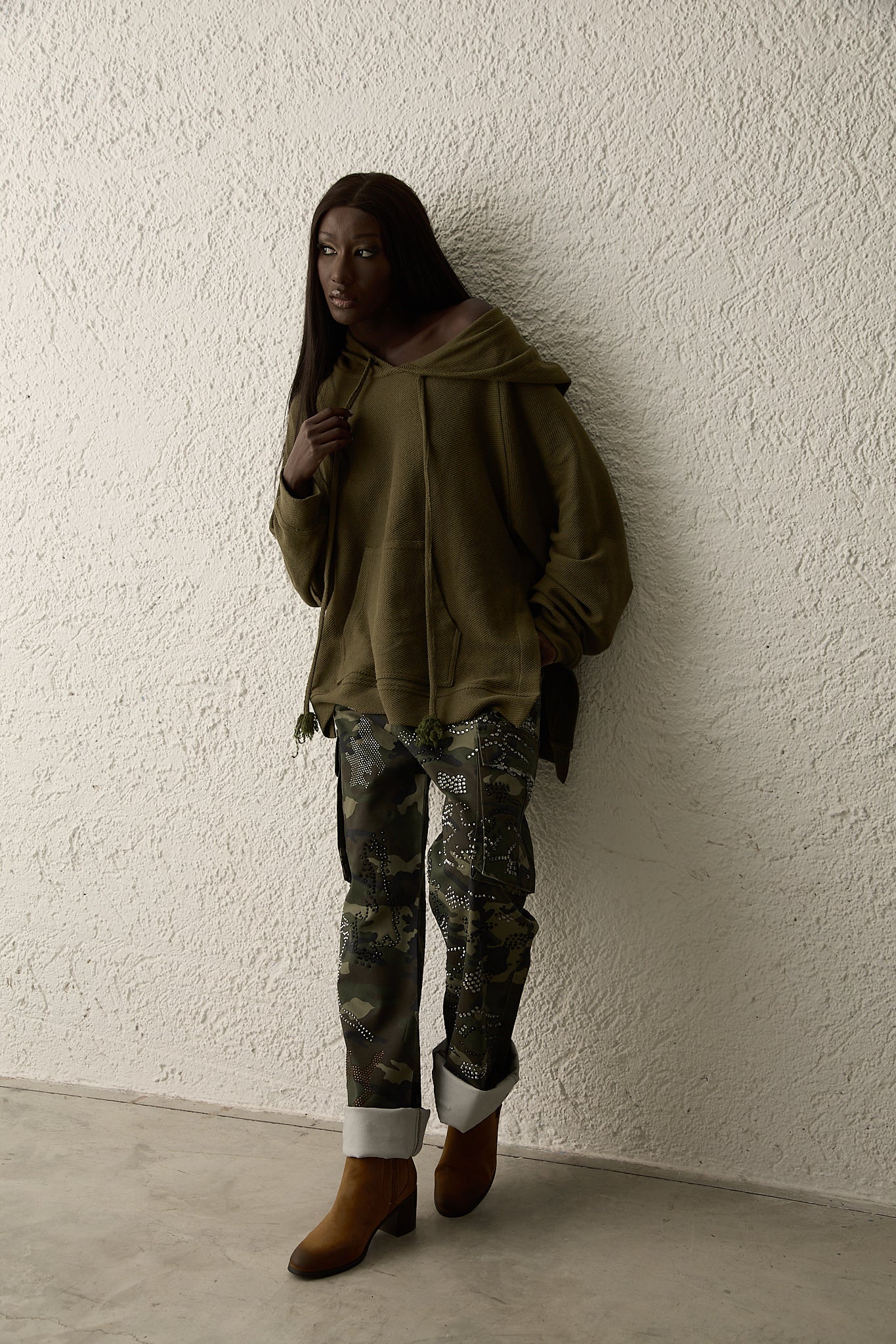 Un'icona utility rivisitata in chiave glamour: il pantalone cargo in stampa camouflage si distingue per i dettagli gioiello applicati che illuminano la texture militare con un twist sofisticato. La linea morbida con tasche laterali capienti e risvolto sul fondo unisce praticità e carattere urbano, perfetta per look casual ma ricercati.