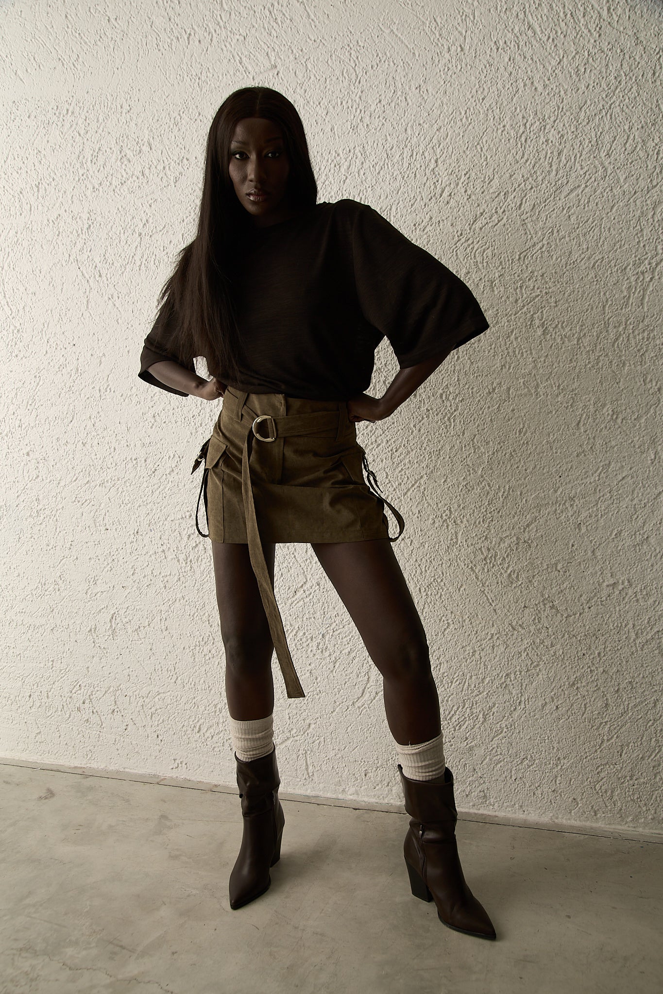 Mini gonna dal taglio moderno con dettagli utility. Realizzata in tessuto strutturato, è caratterizzata da tasche laterali applicate e cintura coordinata con fibbia metallica ad anello, che permette di regolare la vestibilità e definire la silhouette. Un capo versatile, perfetto per look urbani e contemporanei.