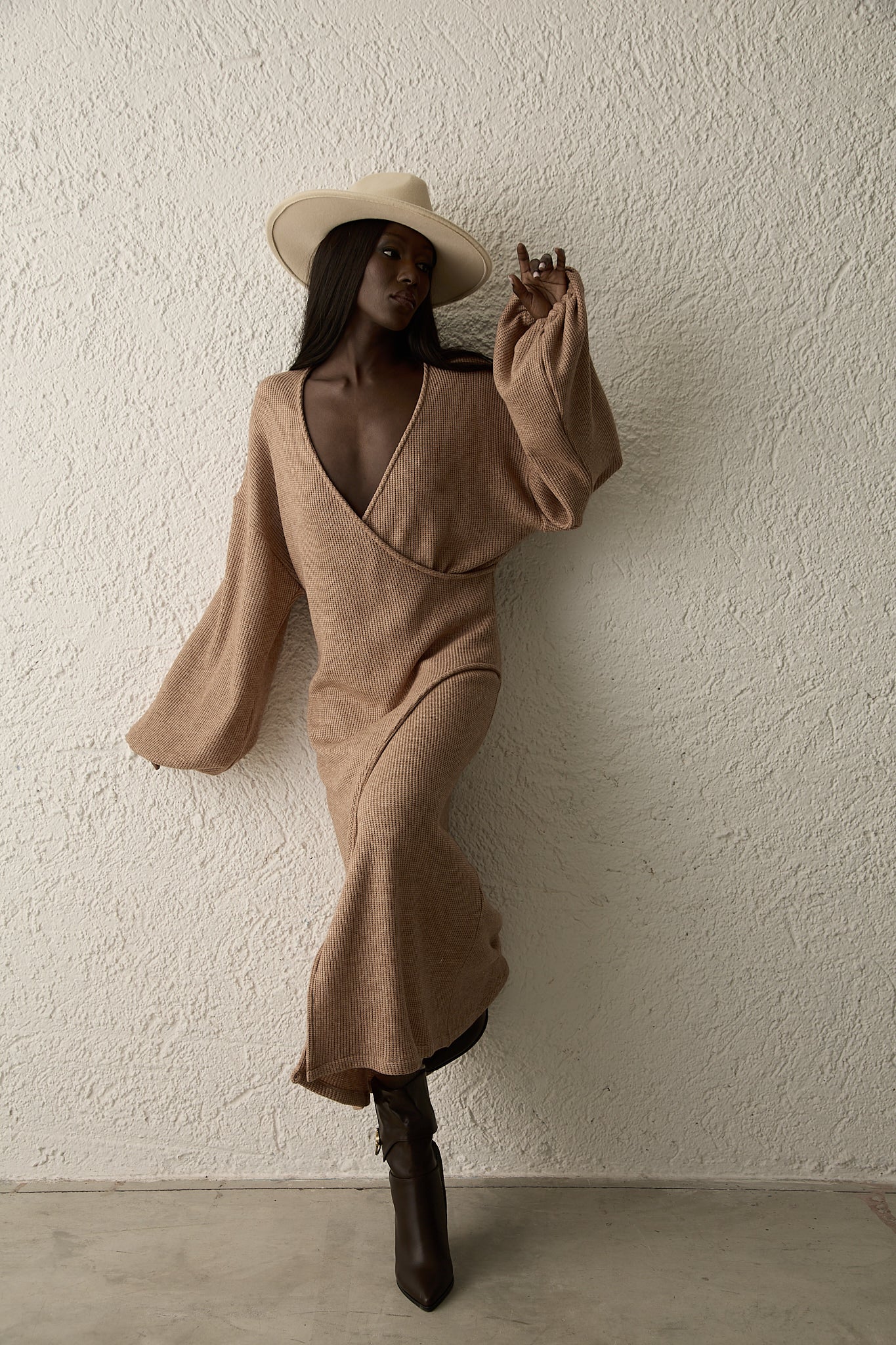 Un’eleganza rilassata che gioca con volumi e texture: l’abito lungo in maglia Bohemianvì avvolge la figura con un ampio scollo a portafoglio e maniche balloon, creando un equilibrio tra morbidezza e sensualità. Il tessuto caldo e la linea fluida lo rendono un capo perfetto per chi cerca uno stile sofisticato ma confortevole, capace di adattarsi a più momenti della giornata.