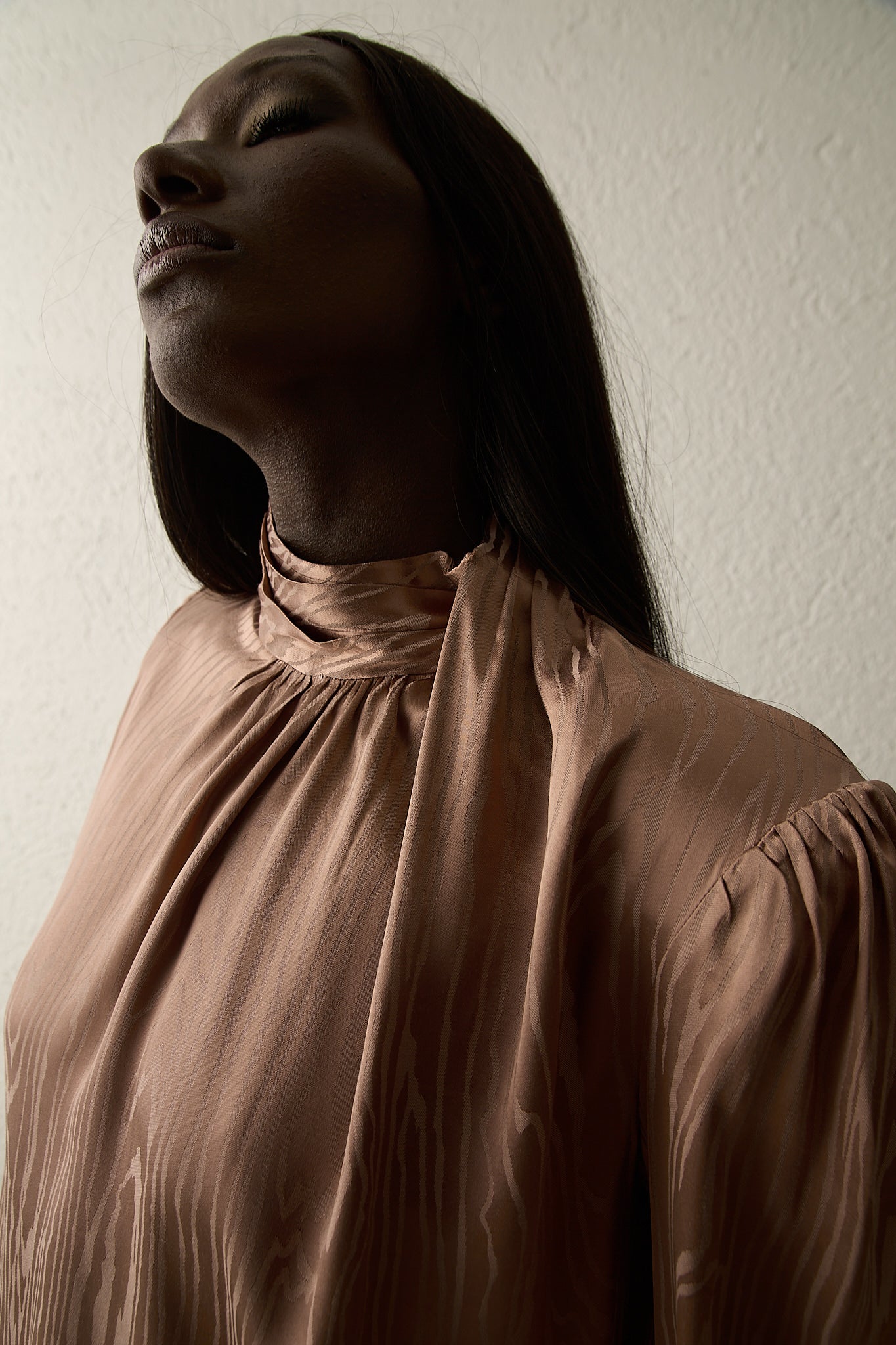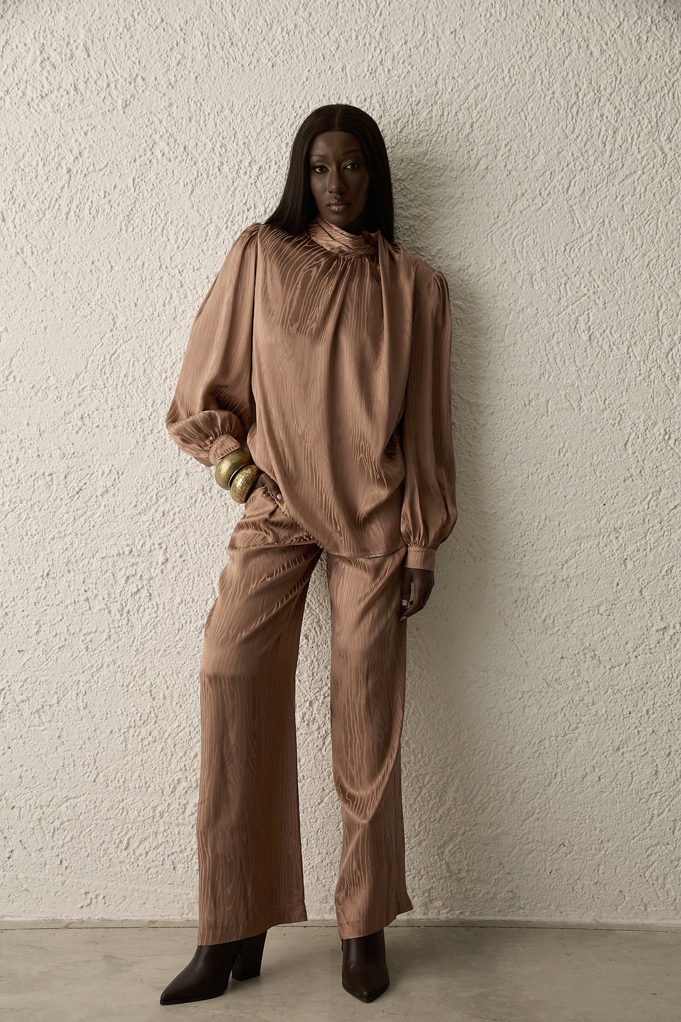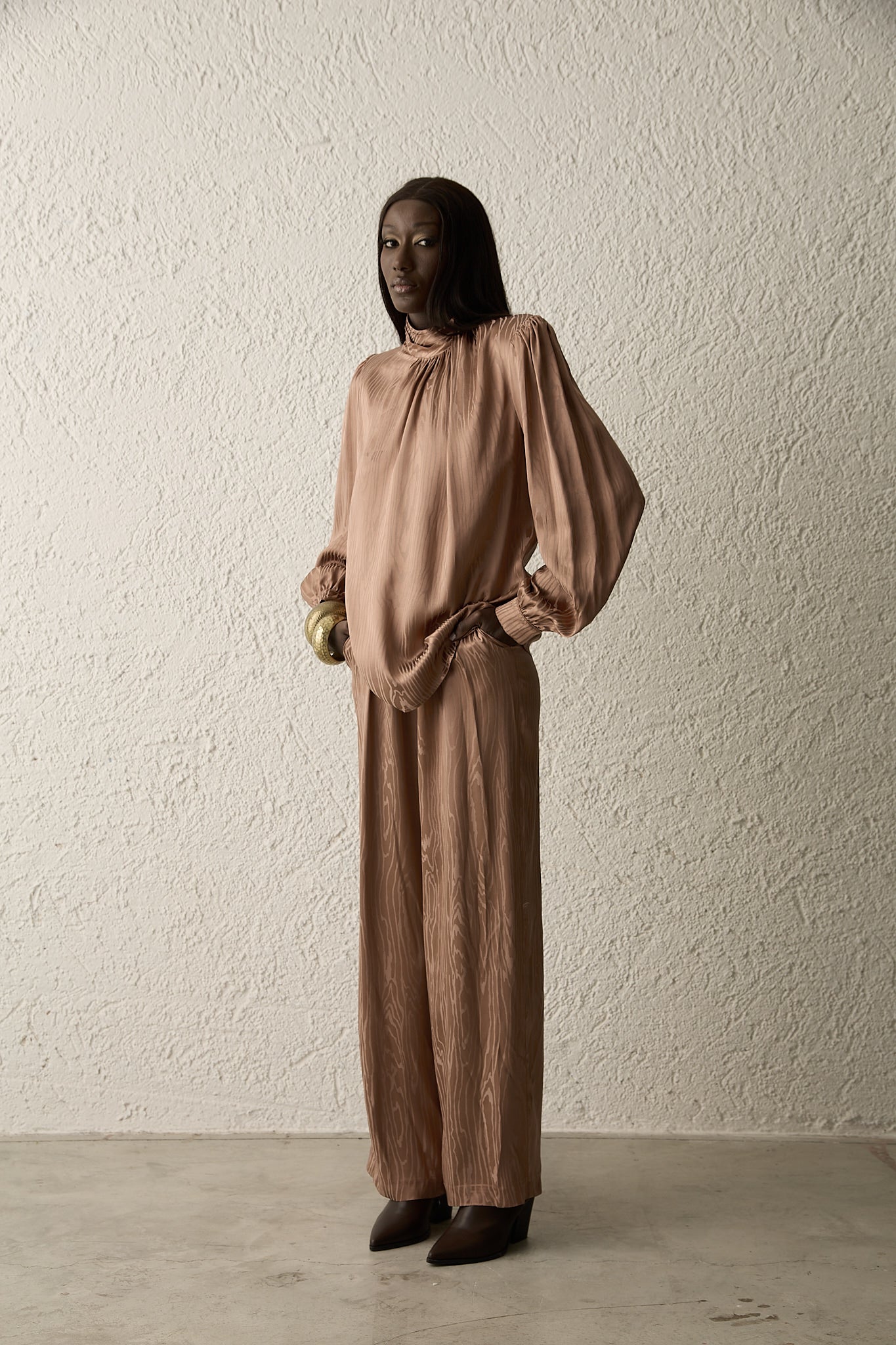 Camicia elegante in tessuto satinato leggero, caratterizzata da un fit morbido e scivolato. Il dettaglio dela lavorazione al collo aggiunge un tocco sofisticato, mentre le maniche lunghe con volume e polsino raccolto creano un effetto fluido e femminile. Perfetta da abbinare al suo pantalone per un look raffinato.