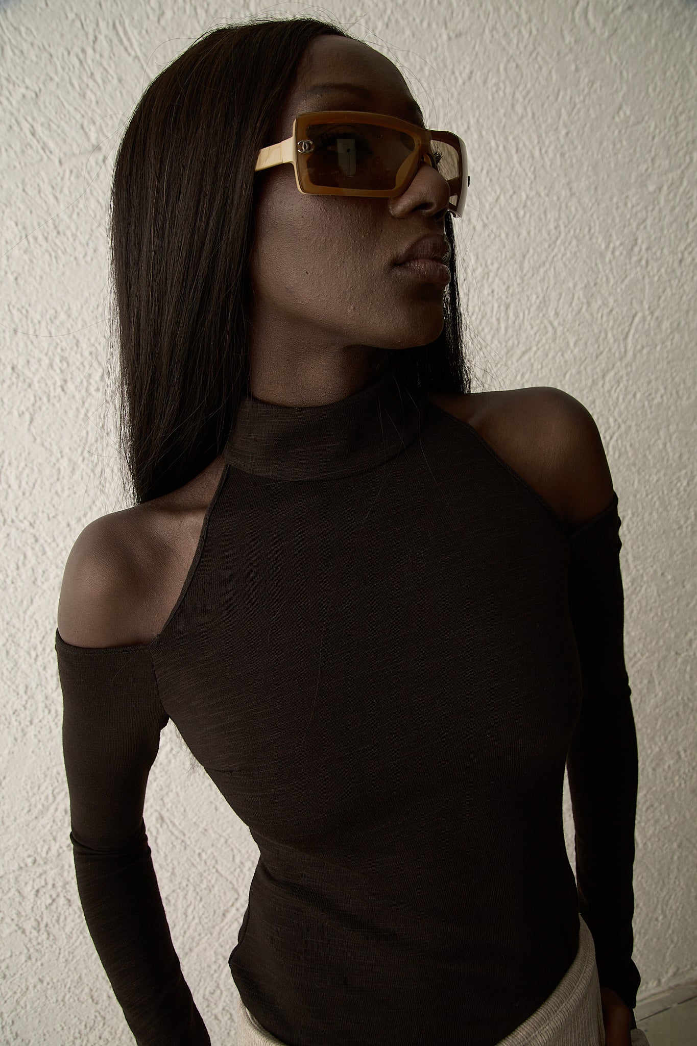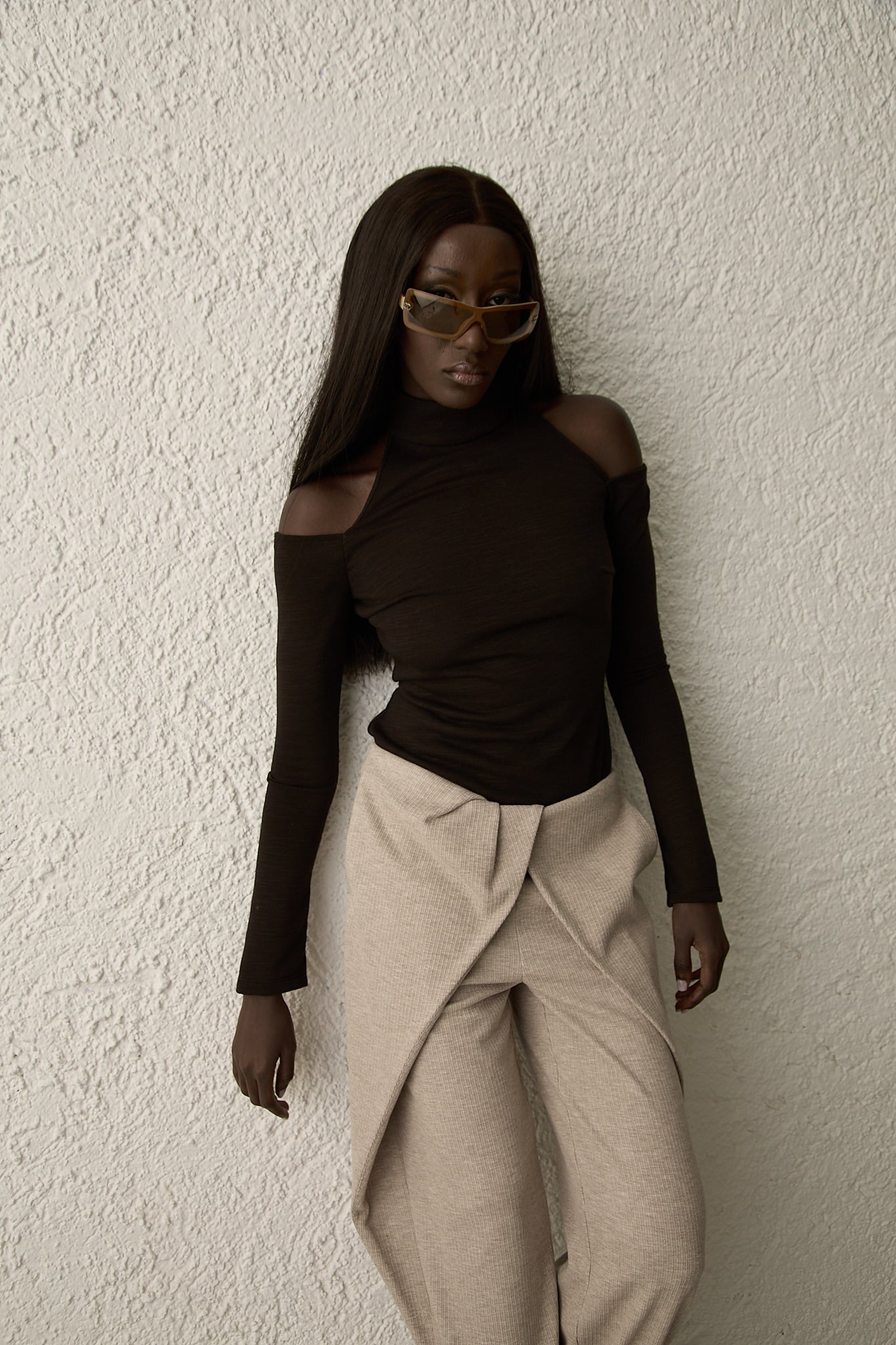 Maglia dal design moderno e sensuale, realizzata in tessuto fiammato leggero che dona un effetto materico raffinato. Il modello presenta collo alto morbido e tagli strategici sulle spalle, che aggiungono carattere e femminilità al capo. Perfetta da indossare sia di giorno con pantaloni a vita alta sia la sera per un look più sofisticato.