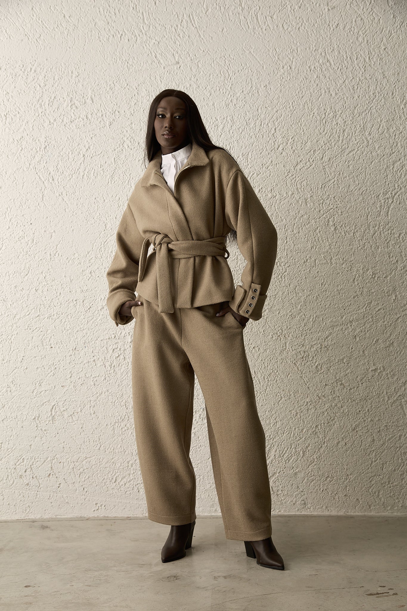 Un modello dal carattere deciso e contemporaneo, ideale per uno stile boho chic quotidiano. Realizzato in tessuto strutturato e confortevole, presenta una linea a banana con gamba morbida che si restringe leggermente al fondo, donando movimento e personalità al look. Perfetto per chi cerca un capo versatile e stiloso da indossare ogni giorno, si abbina con facilità a bluse fluide, maglioni morbidi o giacche over.